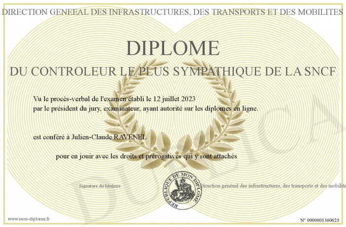 Envoyez par email votre Diplôme du contrôleur le plus sympathique de la sncf personalisé
