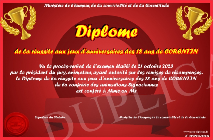 Envoyez par email votre Diplôme de la réussite aux jeux d'anniversaires des 18 ans de CORENTIN personalisé