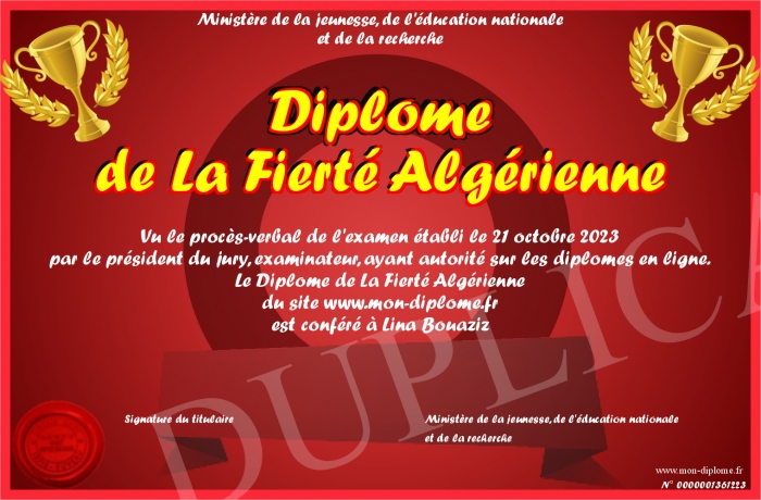 Envoyez par email votre Diplôme de La Fierté Algérienne personalisé