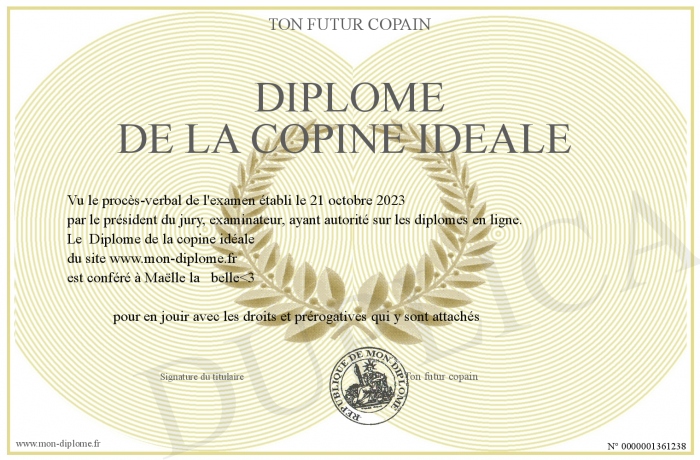 Envoyez par email votre Diplôme de la copine idéale personalisé