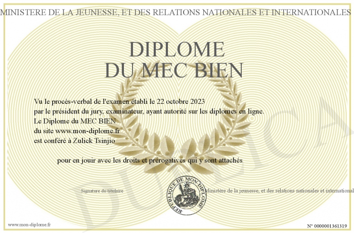 Envoyez par email votre Diplôme du MEC BIEN personalisé