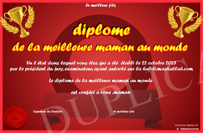 Envoyez par email votre diplome de la meilleure maman au monde personalisé