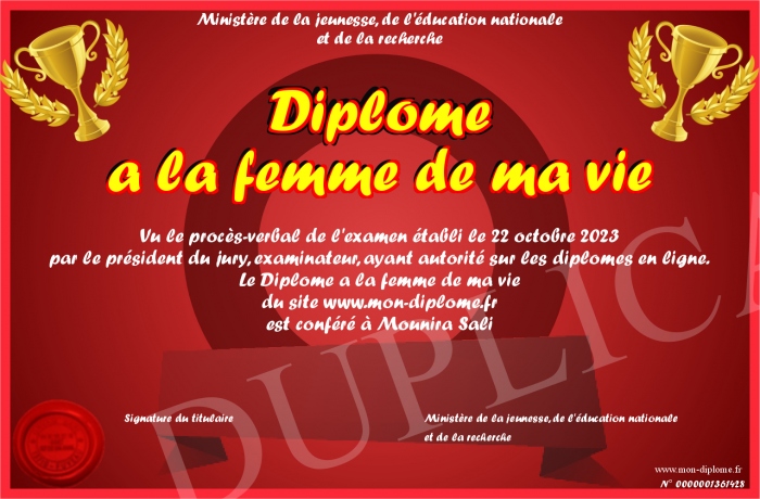 Envoyez par email votre Diplôme a la femme de ma vie personalisé