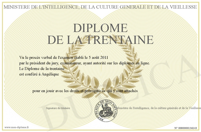 Envoyez par email votre Diplôme de la trentaine personalisé