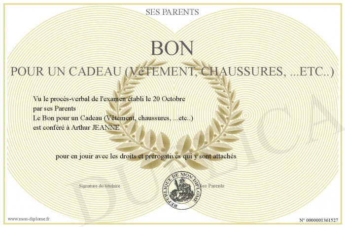 Envoyez par email votre Bon pour un Cadeau (Vêtement, chaussures, ...etc..) personalisé