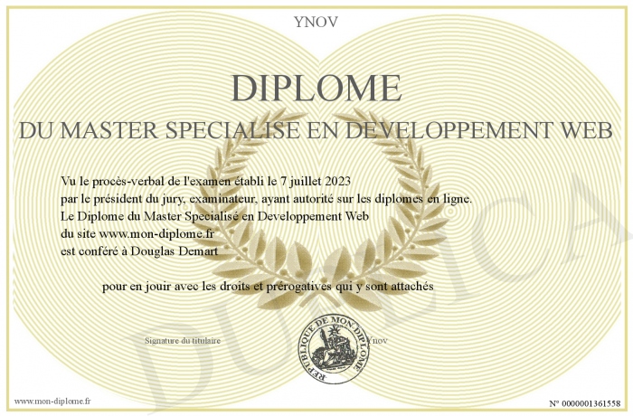 Envoyez par email votre Diplome du master specialise en developpement web personalisé