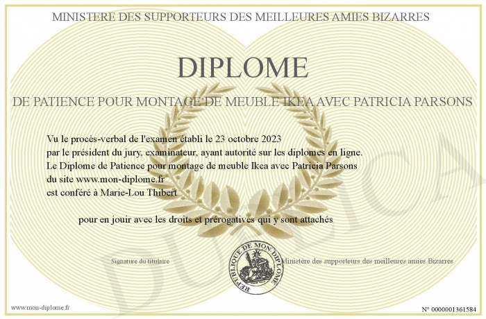 Envoyez par email votre Diplôme de Patience pour montage de meuble Ikea avec Patricia Parsons personalisé