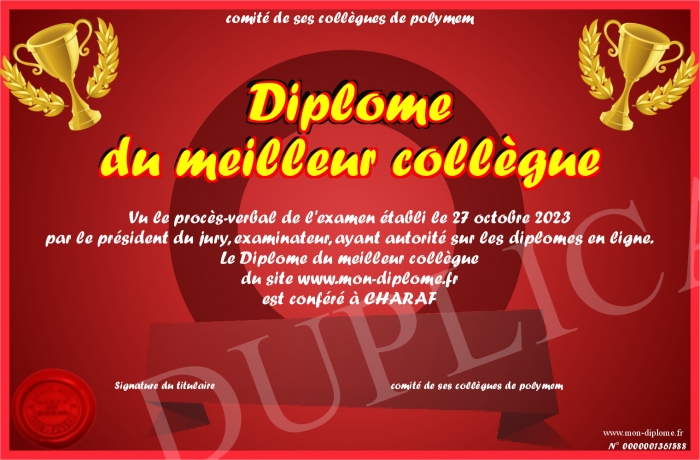 Envoyez par email votre Diplome du meilleur collègue personalisé