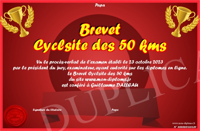 Envoyez par email votre Brevet Cyclsite des 50 kms personalisé