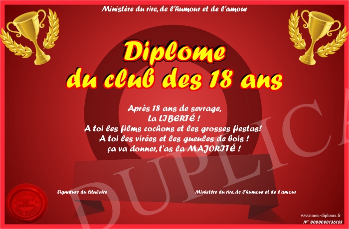Envoyez par email votre Diplome du club des 18 ans personalisé