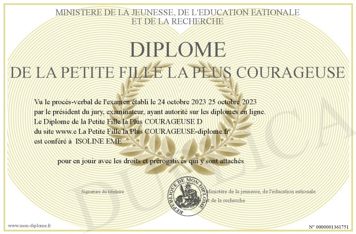 Envoyez par email votre Diplôme de la Petite Fille la Plus COURAGEUSE personalisé