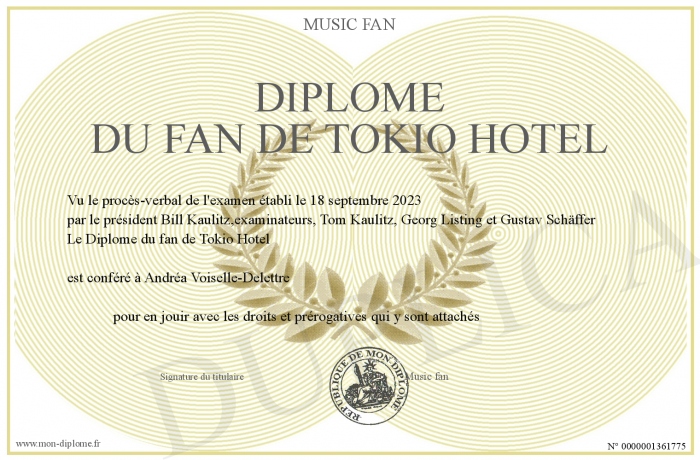 Envoyez par email votre Diplôme du fan de Tokio Hotel personalisé