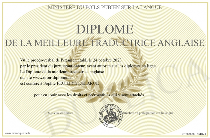 Envoyez par email votre Diplôme de la meilleure traductrice anglaise personalisé
