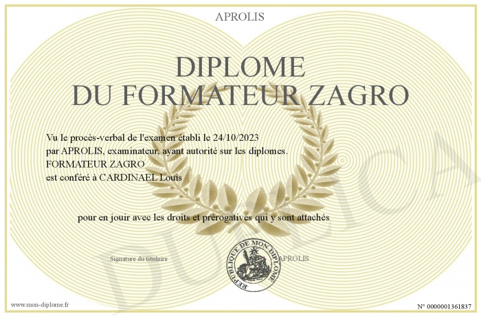 Envoyez par email votre Diplôme du FORMATEUR ZAGRO personalisé