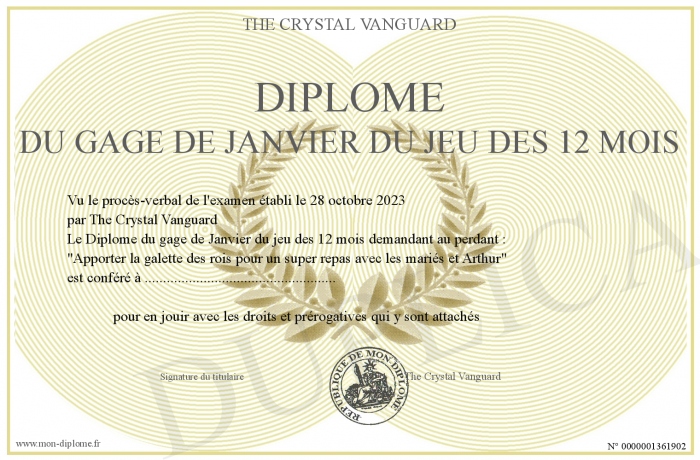 Envoyez par email votre Diplôme du gage de Janvier du jeu des 12 mois personalisé