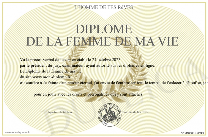 Envoyez par email votre Diplôme de la femme de ma vie personalisé