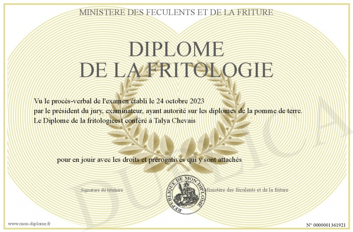 Envoyez par email votre Diplôme de la fritologie personalisé