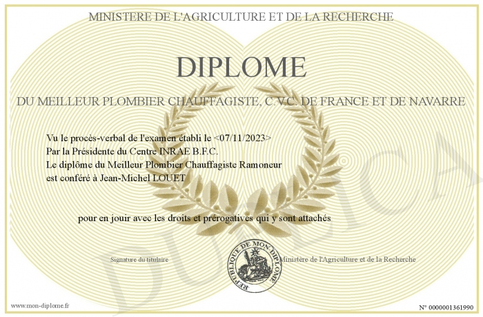 Envoyez par email votre Diplôme du Meilleur Plombier Chauffagiste, C.V.C. de France et de Navarre personalisé