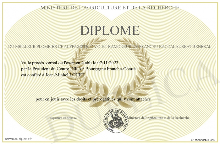 Envoyez par email votre Diplôme du Meilleur Plombier Chauffagiste, C.V.C. et RAMONEUR de Franceu baccalaureat général personalisé