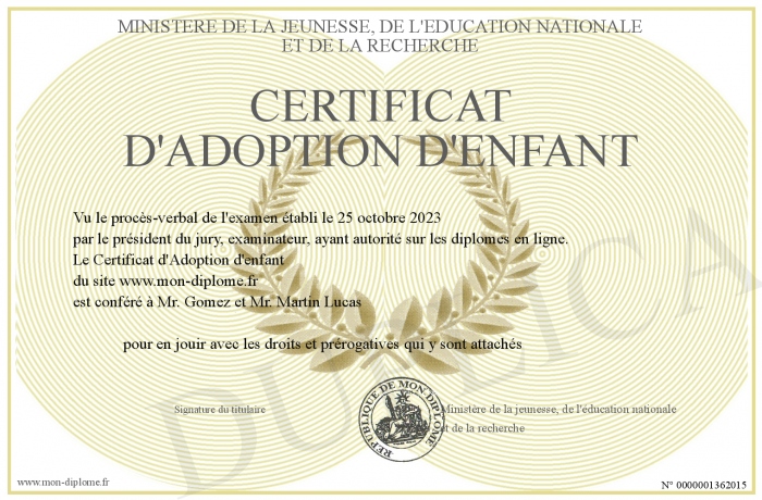 Envoyez par email votre Certificat d'Adoption d'enfant personalisé