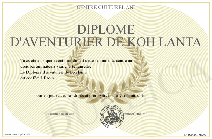 Envoyez par email votre Diplôme d'aventurier de koh lanta personalisé