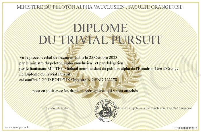 Envoyez par email votre DIPLOME DU TRIVIAL PURSUIT personalisé