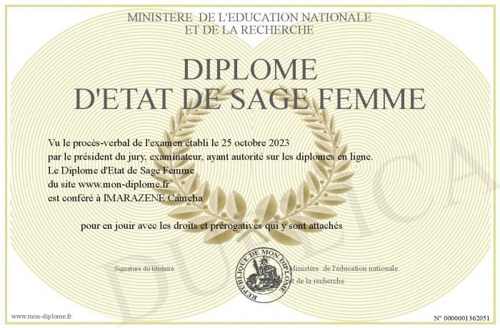 Envoyez par email votre Diplome d'Etat de Sage Femme personalisé