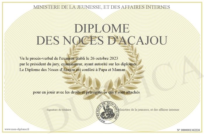 Envoyez par email votre Diplôme des Noces d'Acajou personalisé