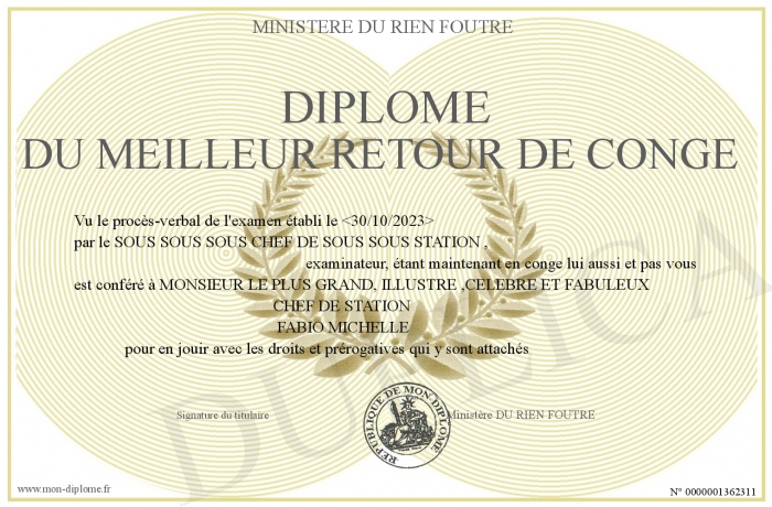 Envoyez par email votre Diplôme du MEILLEUR RETOUR DE CONGE personalisé