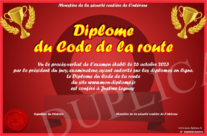 Envoyez par email votre Diplôme du Code de la route personalisé