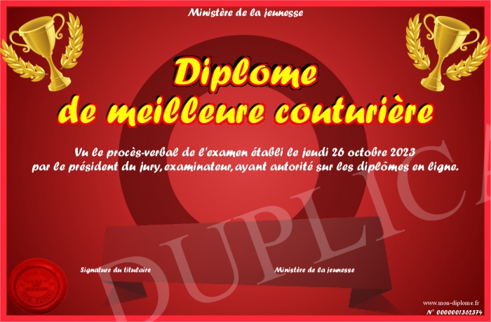 Envoyez par email votre Diplôme de meilleure couturière personalisé