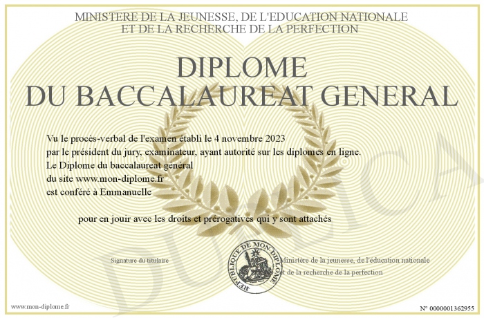 Envoyez par email votre Diplôme du baccalaureat général personalisé