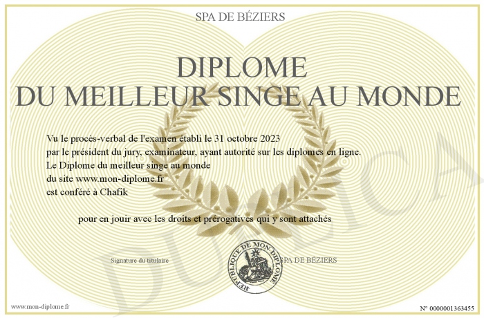 Envoyez par email votre Diplôme du meilleur singe au monde personalisé