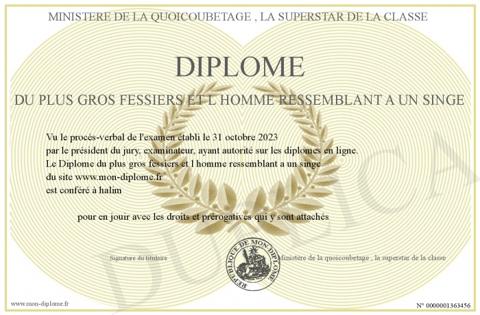 Envoyez par email votre Diplôme du plus gros fessiers et l homme ressemblant a un singe personalisé