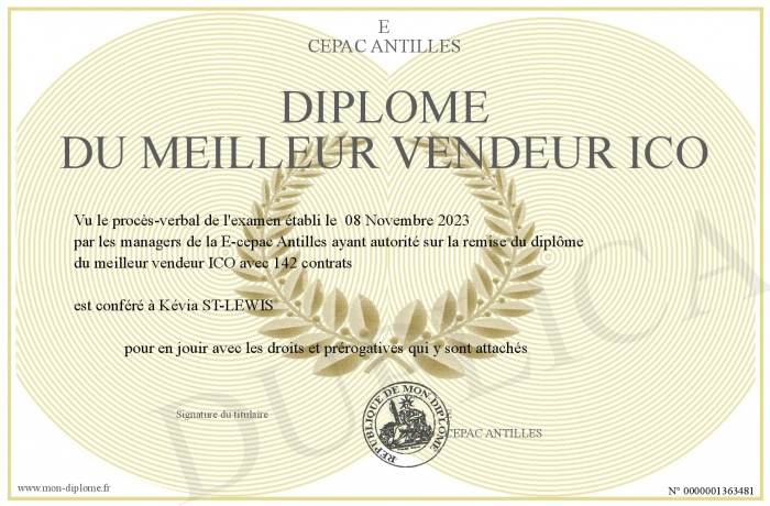 Envoyez par email votre Diplôme du MEILLEUR VENDEUR ICO personalisé