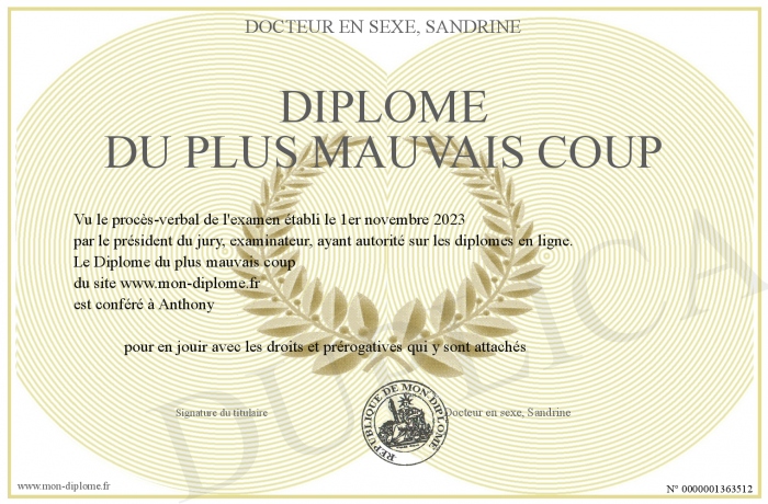 Envoyez par email votre Diplôme du plus mauvais coup personalisé