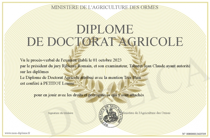 Envoyez par email votre Diplôme de Doctorat Agricole personalisé