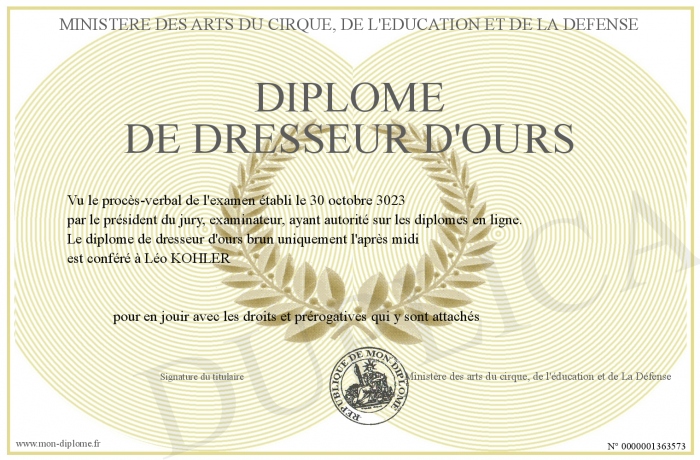 Envoyez par email votre Diplôme de dresseur d'ours personalisé