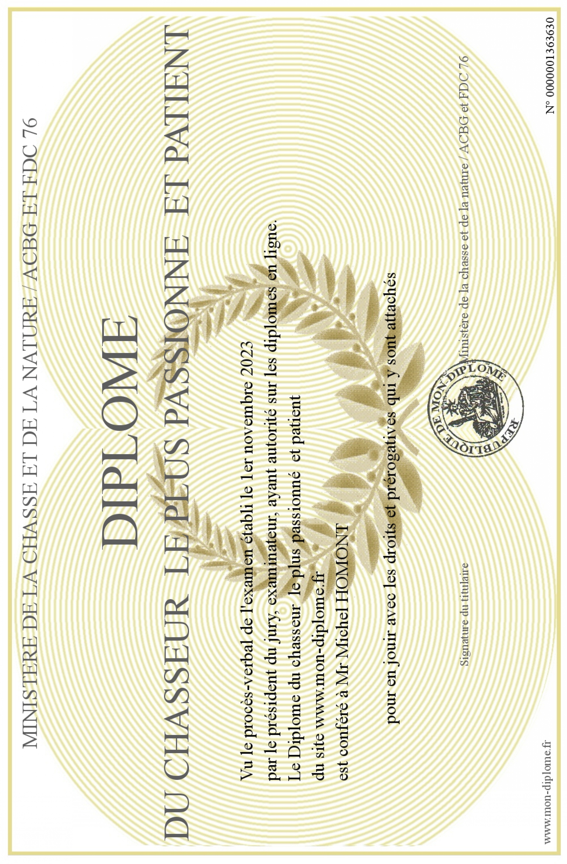Envoyez par email votre Diplôme du chasseur le plus passionné et patient personalisé