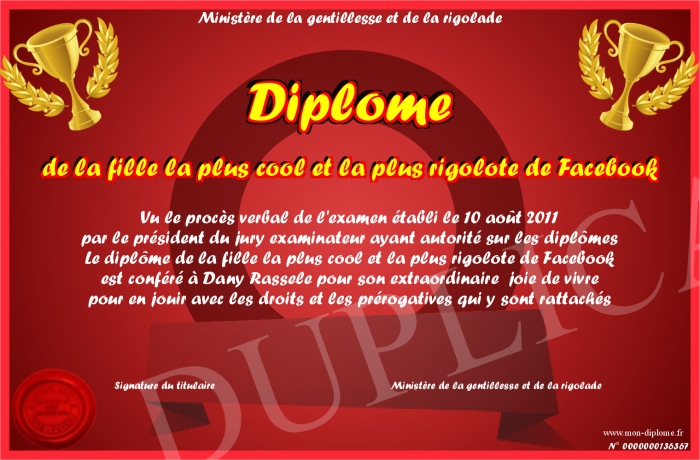 Envoyez par email votre Diplôme de la fille la plus cool et la plus rigolote de Facebook personalisé