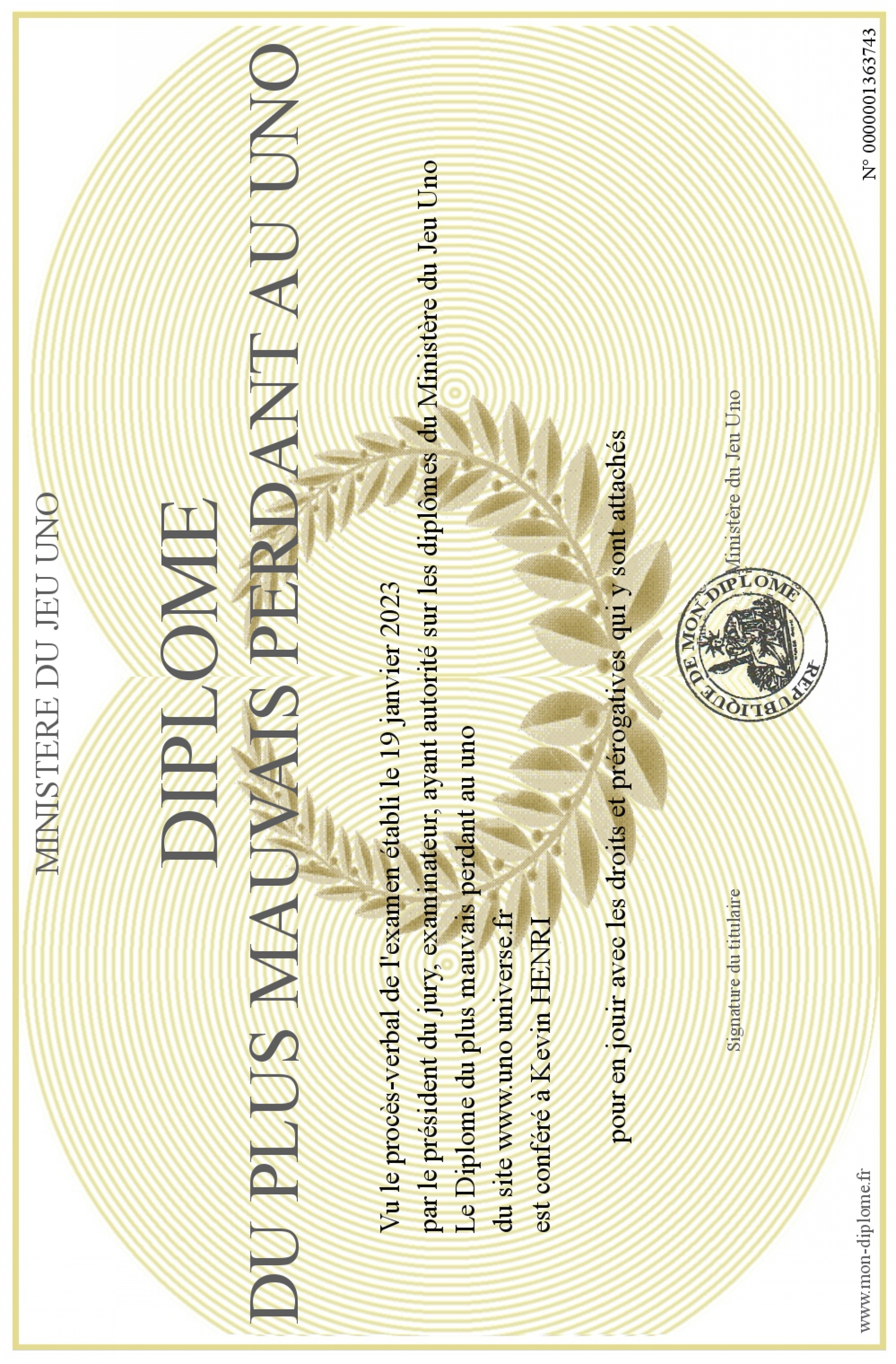Envoyez par email votre Diplôme du plus mauvais perdant au uno personalisé