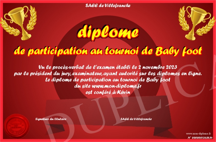 Envoyez par email votre diplome de participation au tournoi de Baby foot personalisé