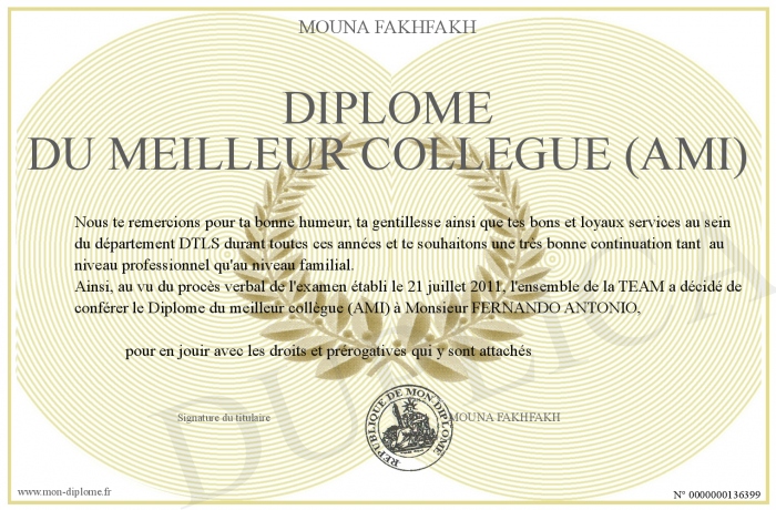 Envoyez par email votre Diplôme du meilleur collègue (AMI) personalisé