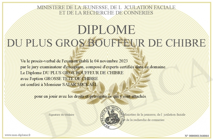 Envoyez par email votre Diplôme DU PLUS GROS BOUFFEUR DE CHIBRE personalisé