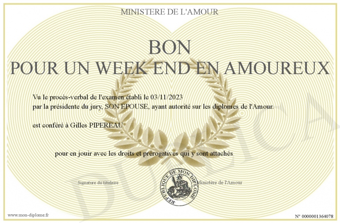 Envoyez par email votre BON POUR UN WEEK END EN AMOUREUX personalisé