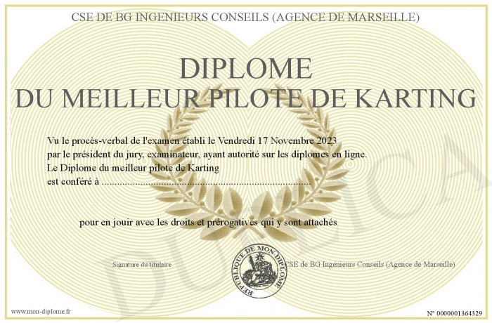 Envoyez par email votre Diplôme du meilleur pilote de Karting personalisé