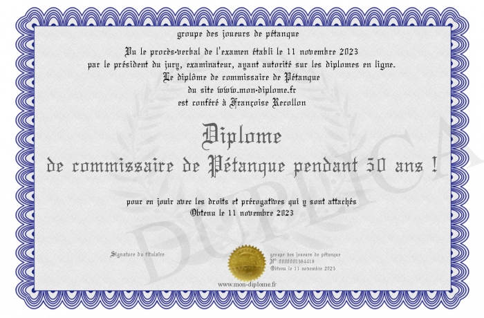 Envoyez par email votre Diplôme de commissaire de Pétanque pendant 50 ans ! personalisé