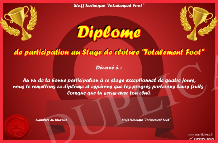 Envoyez par email votre Diplôme de participation au Stage de clôture -Totalement Foot- personalisé