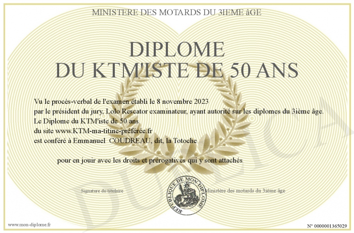 Envoyez par email votre Diplôme du KTM'iste de 50 ans personalisé