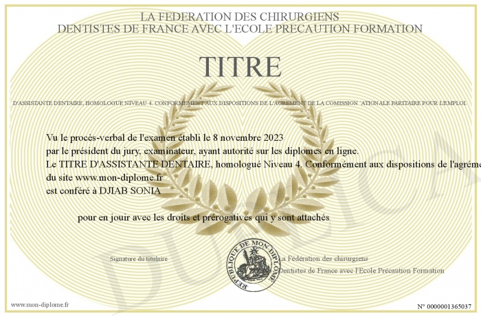 Envoyez par email votre TITRE D'ASSISTANTE DENTAIRE, homologué Niveau 4. Conformément aux dispositions de l'agrément de la Comission ´ationale Paritaire pour l'Emploi. personalisé